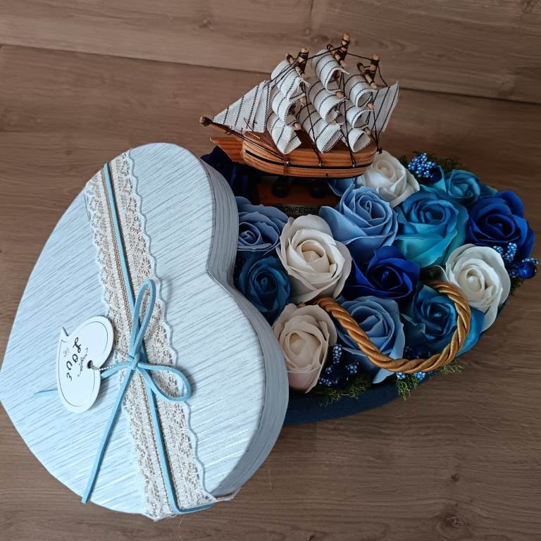 A hajózás szerelmesének tökéletes ajándéka lesz ez a tengerkék szív boxban található szappanvirág áradat.