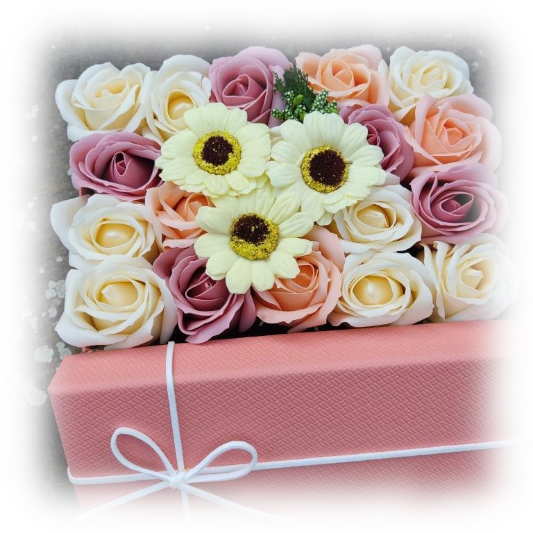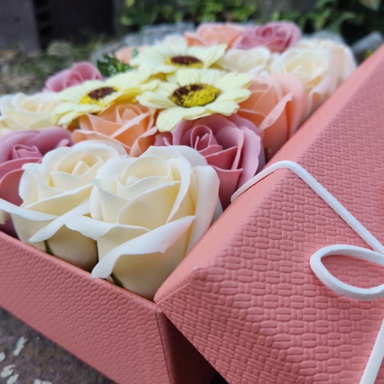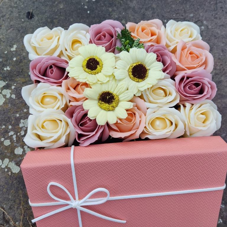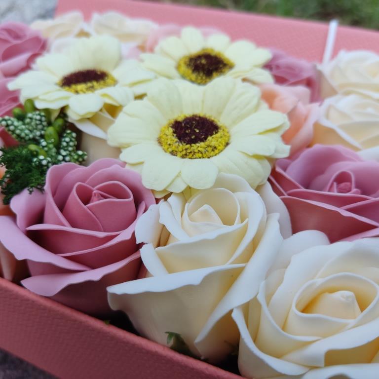 A mályva, vaj- és barackszínű rózsák és a halvány sárga margaréta mind mind illatos, élethű szappanvirágok.