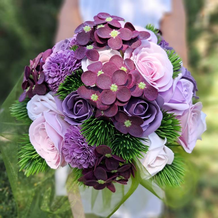 Többféle lila színű rózsák, hortenzia és dália virágokból készült virágcsokrot zölddel dúsítottuk.
